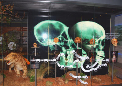 The exhibition also introduces visitors to the famous fossils which have been discovered in these caves, most notably Mrs Ples, a 2.1-million-year-old Australopithecus skull and Little Foot, an almost complete Australopithecus skeleton more than three million years old. The vital importance of these discoveries for our understanding of man’s evolution is also outlined in the exhibition.